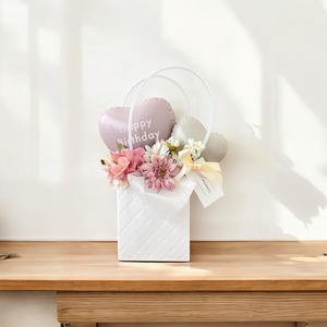 くすみカラーのバルーンとお花ををふんわり詰め込んだ、華やかで心温まるギフト。