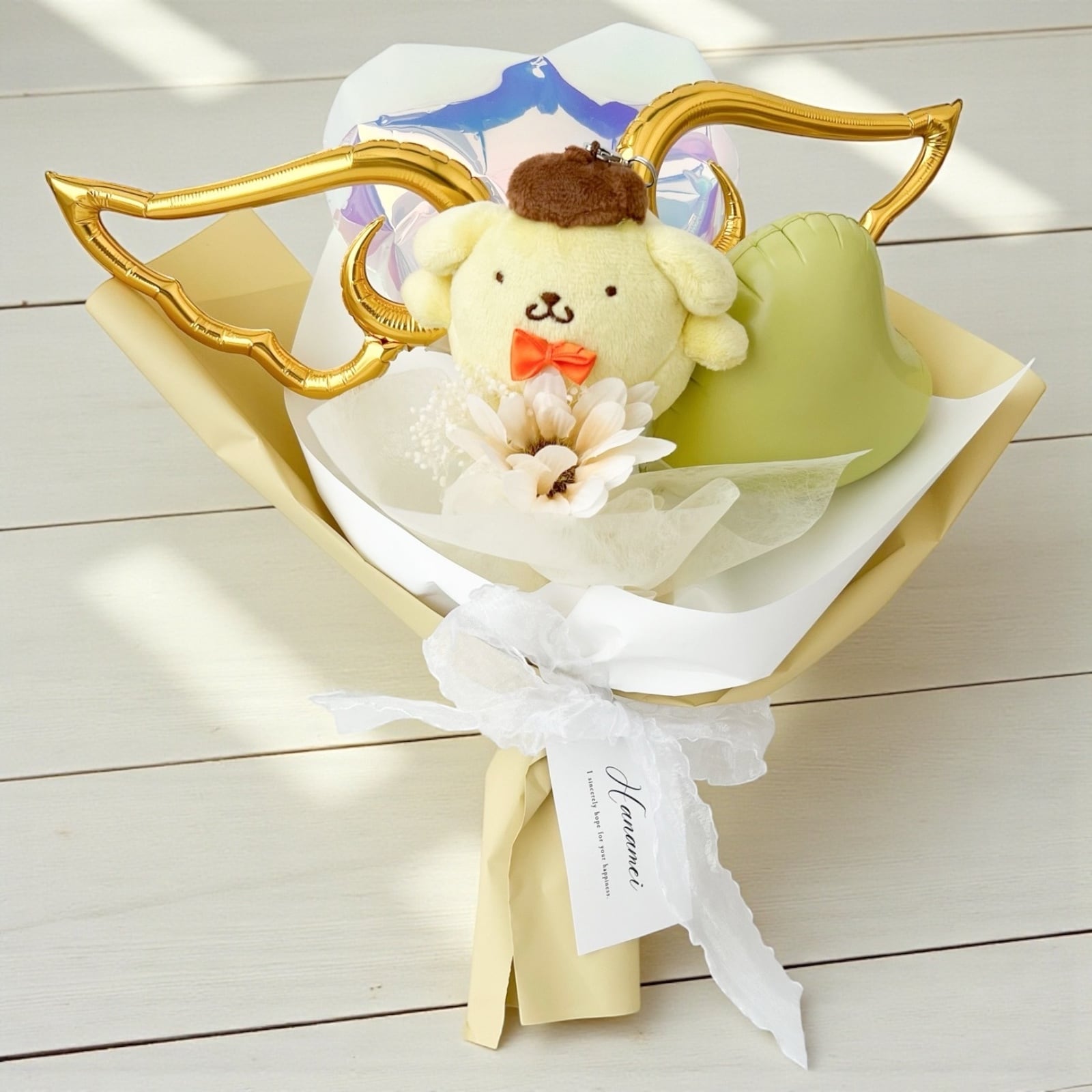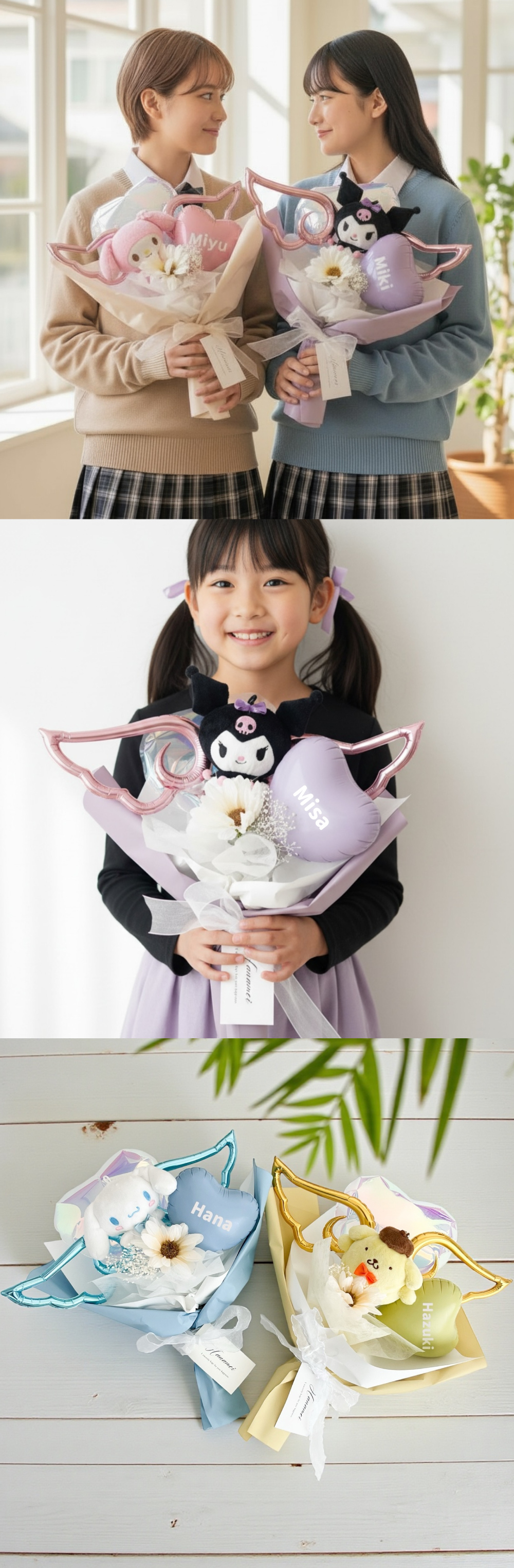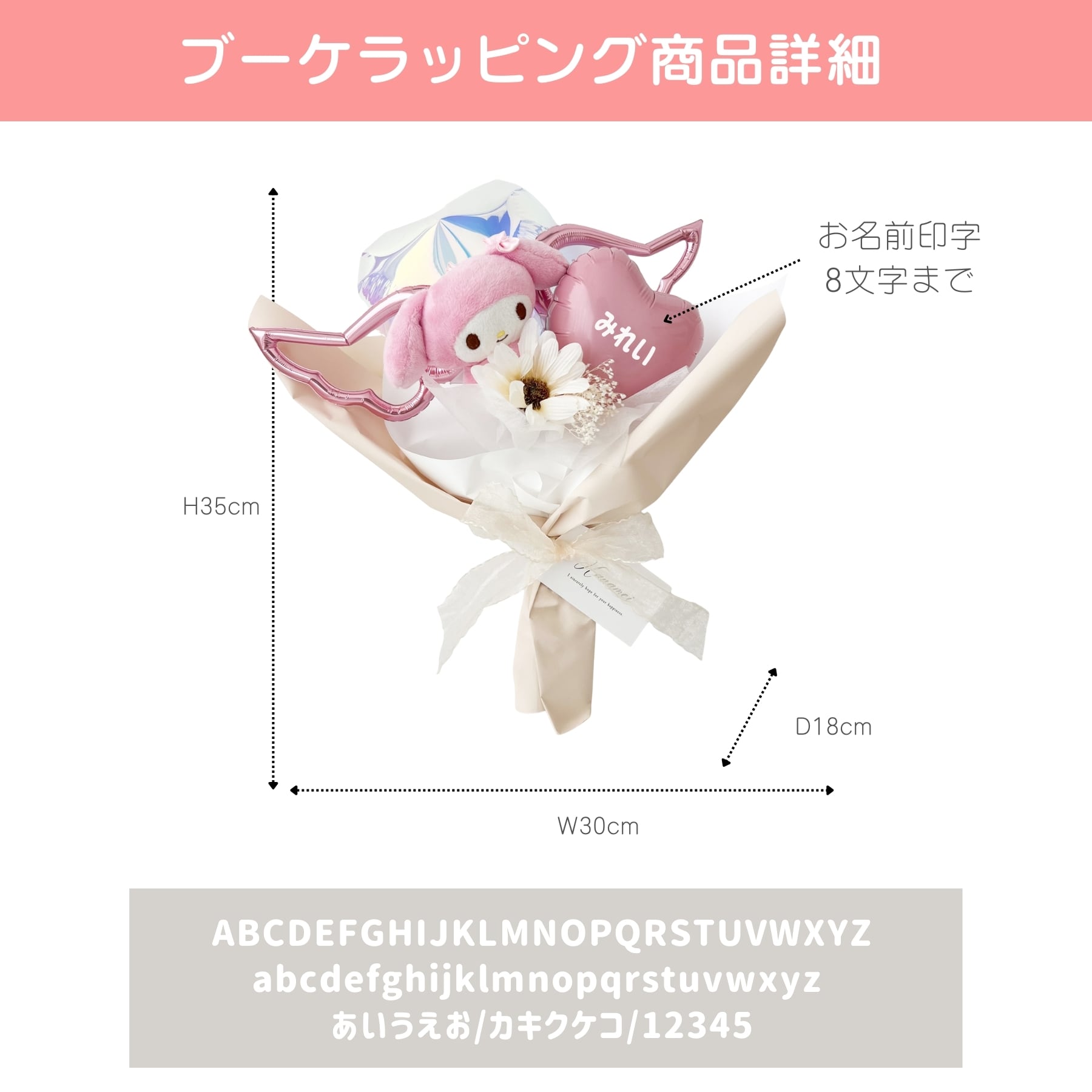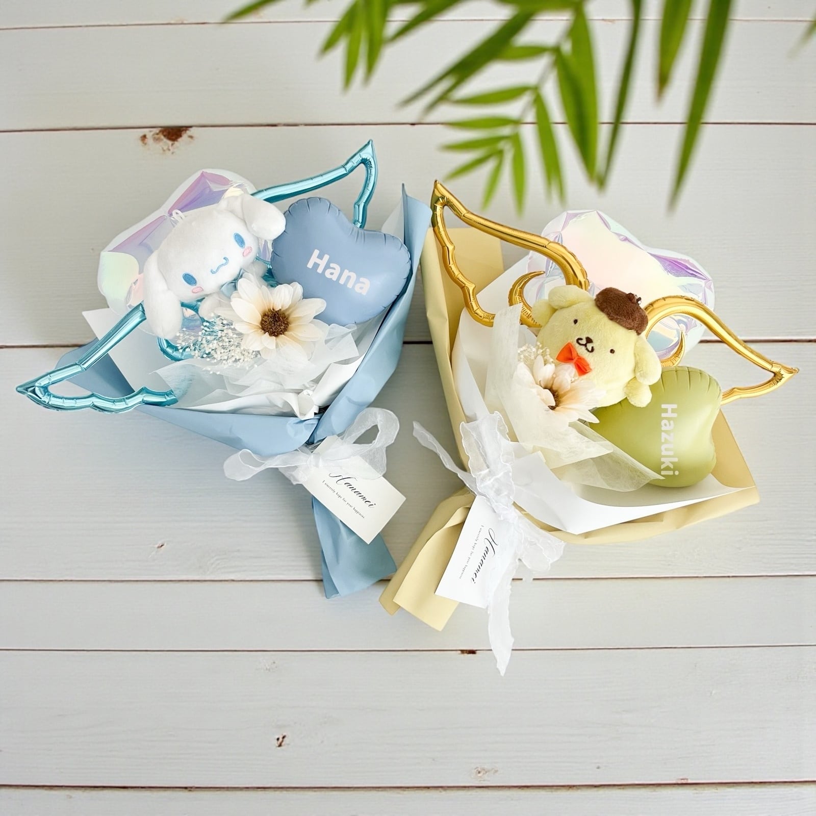 マスコットをふんわり包みこむようなブーケ風のラッピングで華やかにお届けします。