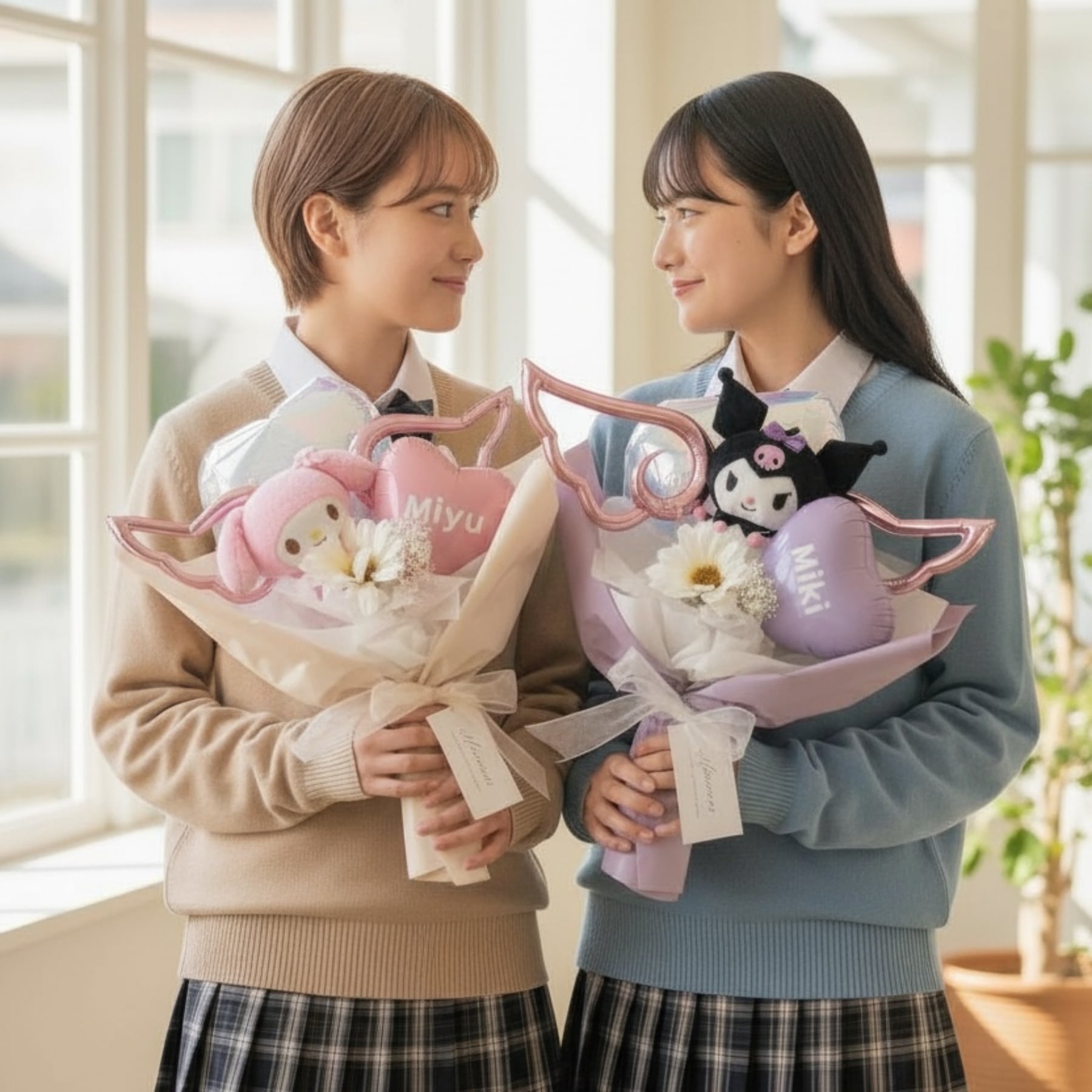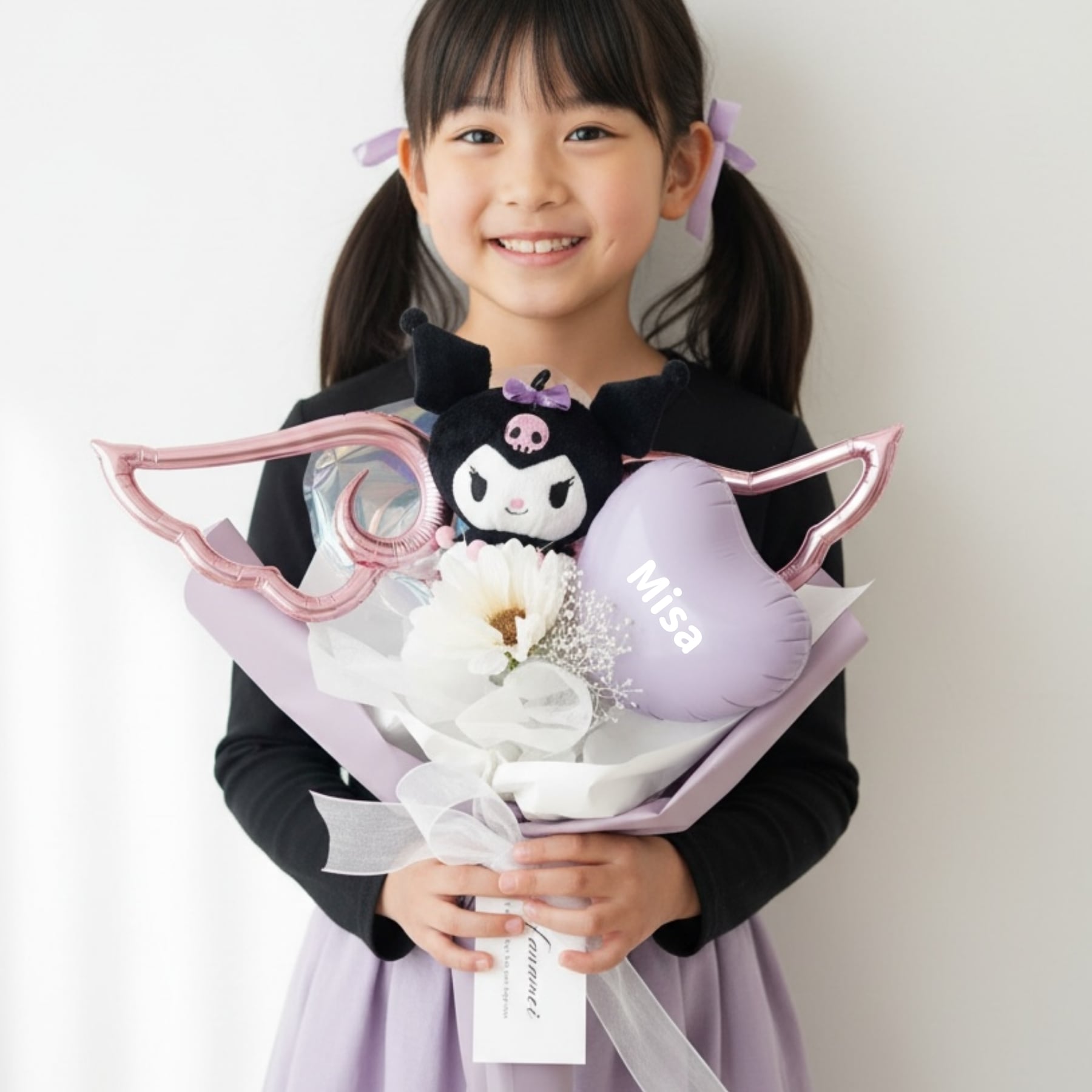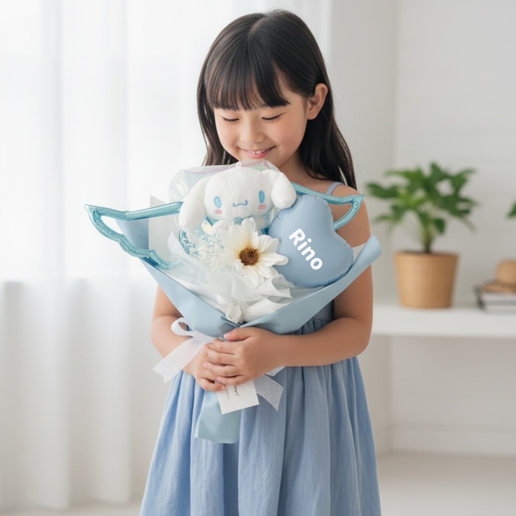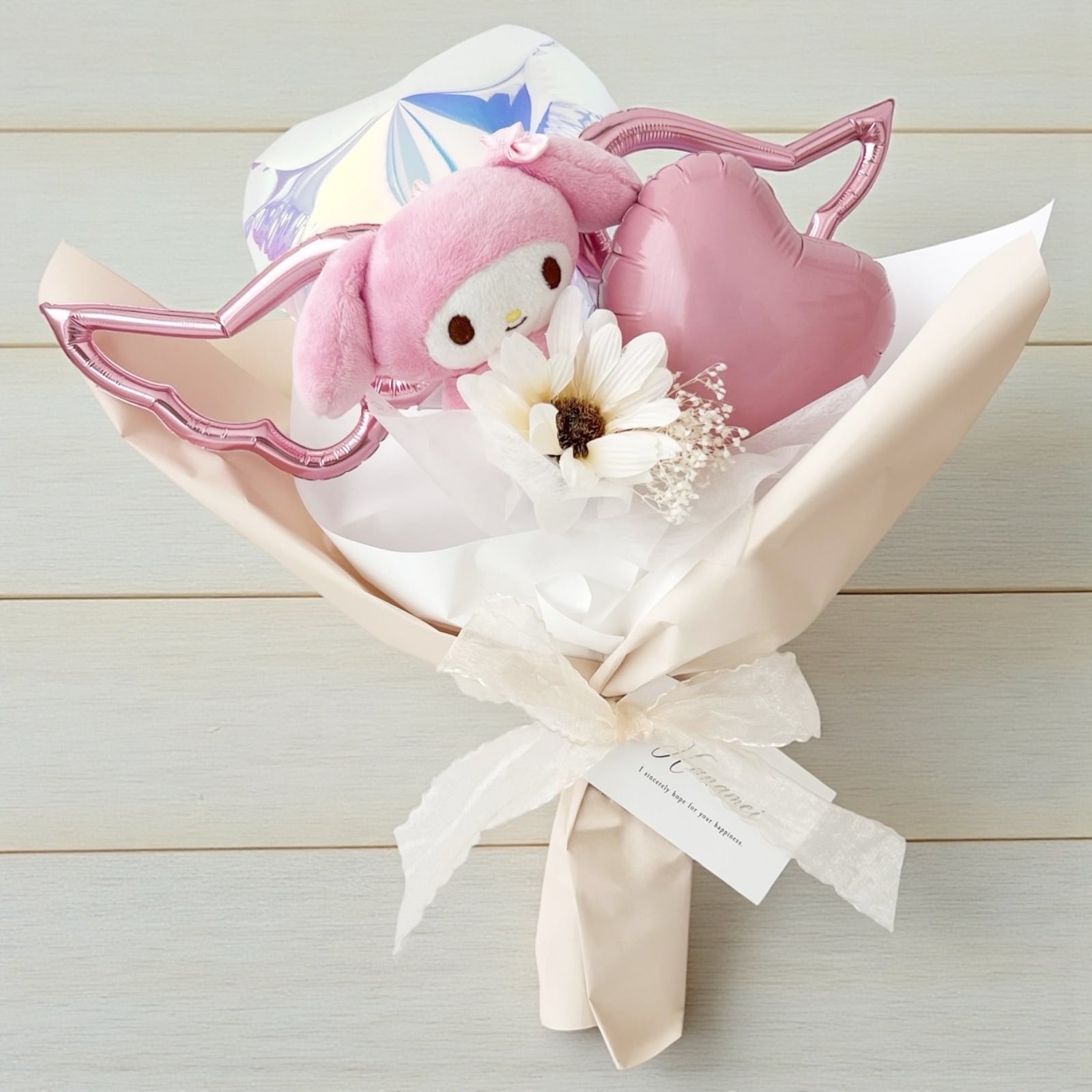 マスコットをふんわり包みこむようなブーケ風のラッピングで華やかにお届けします。
