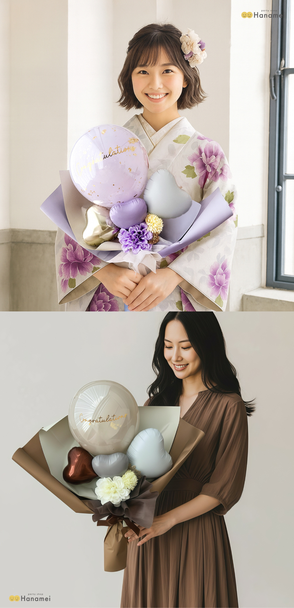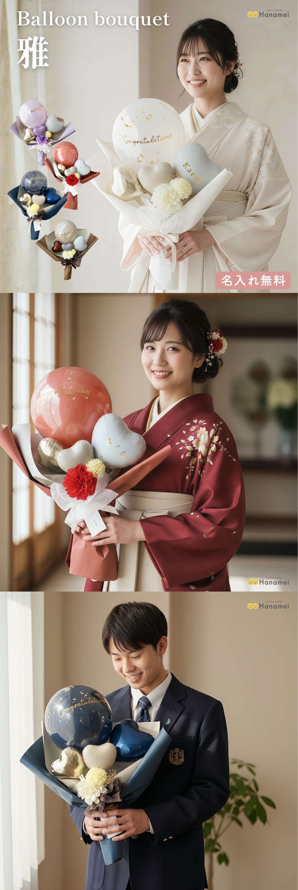 お友達やご家族・親戚と記念写真などおすすめのお祝い電報バルーンです。